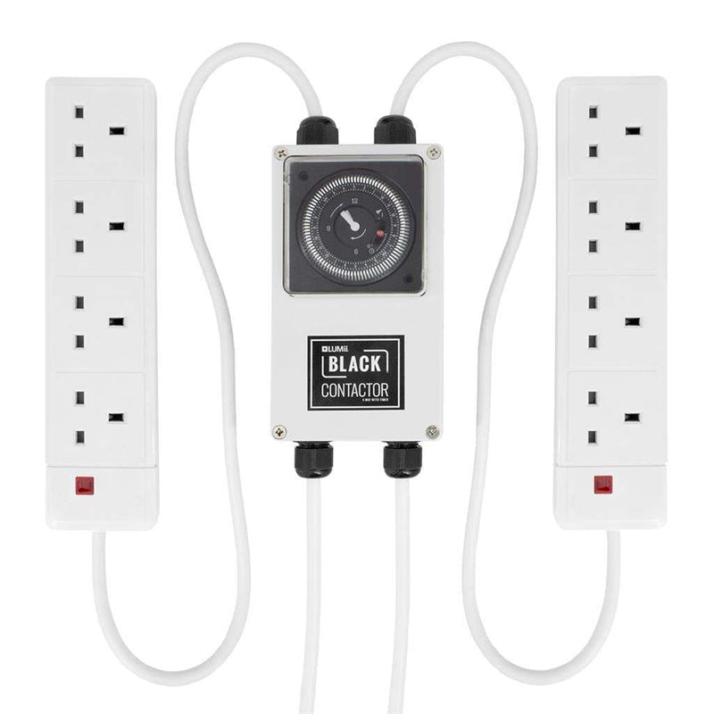 The LUMii Black Contactors are a cost-effective option for the scheduling of your grow lights. The unit enables you to set optimum light levels during the day. The contactors' mechanical timer can be set in 15-minute increments. The relay switch activates HID lights. The contactors are available in 4 and 8-way versions. Growers worldwide use LUMii Black Contactors to streamline their grow room lighting.