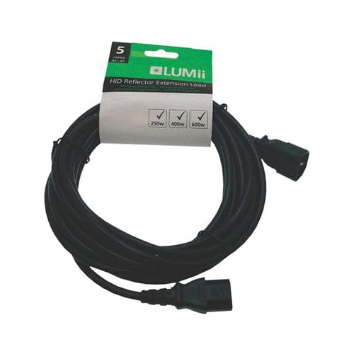 The LUMii Extension Lead is available in 2 lengths such as 1.5 meters and 5 meters. The extension cable is compatible with any IEC reflectors. When you use the LUMii extension for HID, check if the ballast is made to ignite the bulb over increased distances. LUMii's ballasts are designed to ignite lamps from 15 meters away from the ballast. The extension includes a female and male IEC plug attached to each end. This way, you can easily extend the grow light cables.