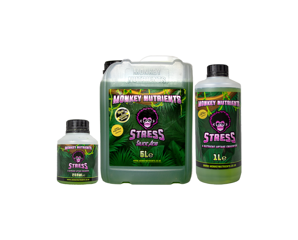 Monkey Stress is a stable and bio-available form of silicon, called mono-silicic acid (also called Ortho-silicic acid). Although not an essential nutrient for plant life, it has been found to be an extremely beneficial growth hack. The formula is highly concentrated with it’s effects quickly visible. Plants given Stress will show a robust vigour, which will help support it physically and protect it from abiotic and biotic stresses.